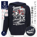 掃海艇みやじまの船名の由来とされる、広島県廿日市市の宮島の厳島神社の守り神「弁財天」をモチーフに、鳥居や機雷、掃海具などをデザインしたジップアップタイプパーカー。