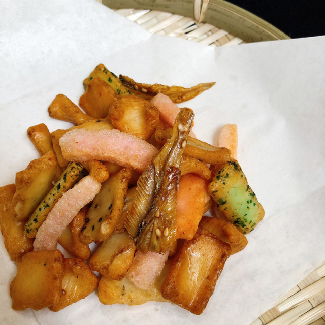 ●原材料名:水稲もち米(国産)、砂糖、醤油(大豆、小麦)、焼きのり、青のり、ゴマ、えび、アジ子、昆布、唐辛子、調味料(アミノ酸等)、着色料(赤3、赤106、黄4、黄5、青1、カラメル)