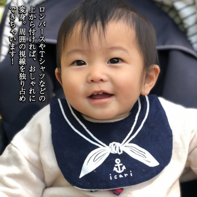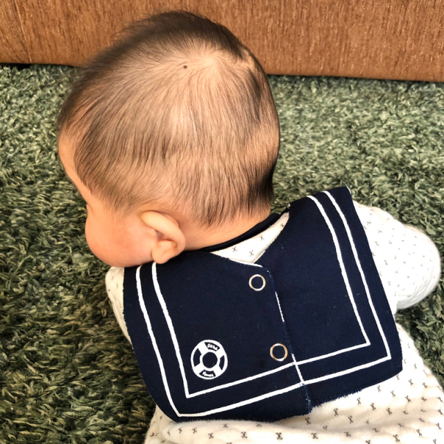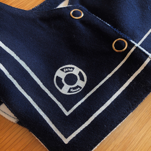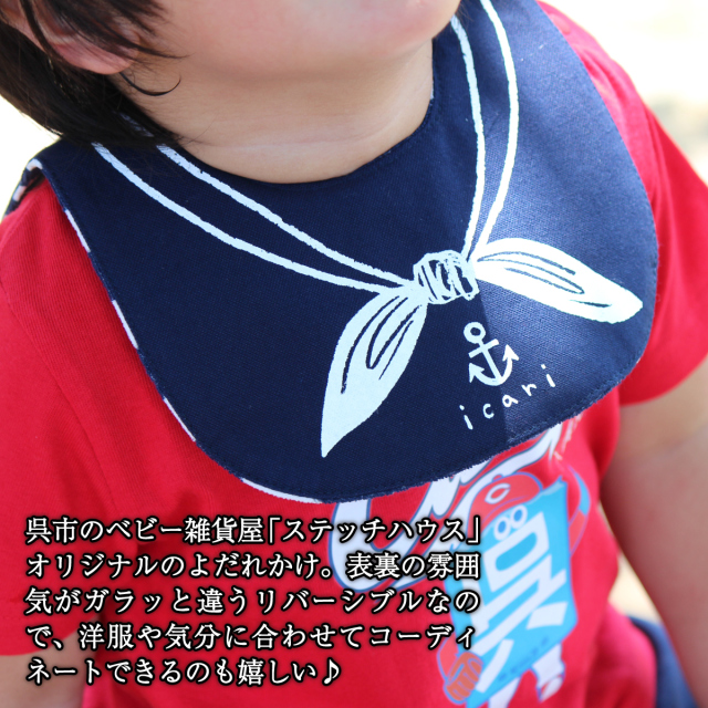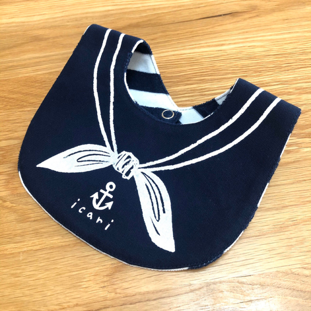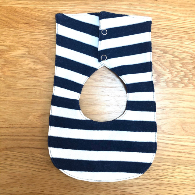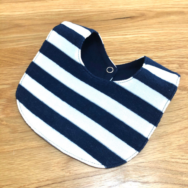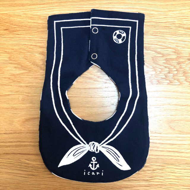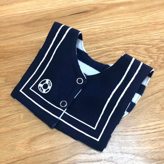セーラーカラーのスナップ式リバーシブルビブです。
