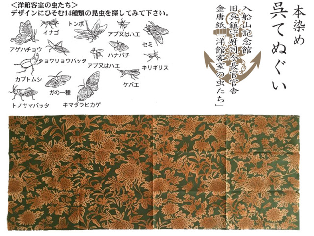 その金唐紙「洋館客室の虫たち」を本染め手ぬぐいにしました。