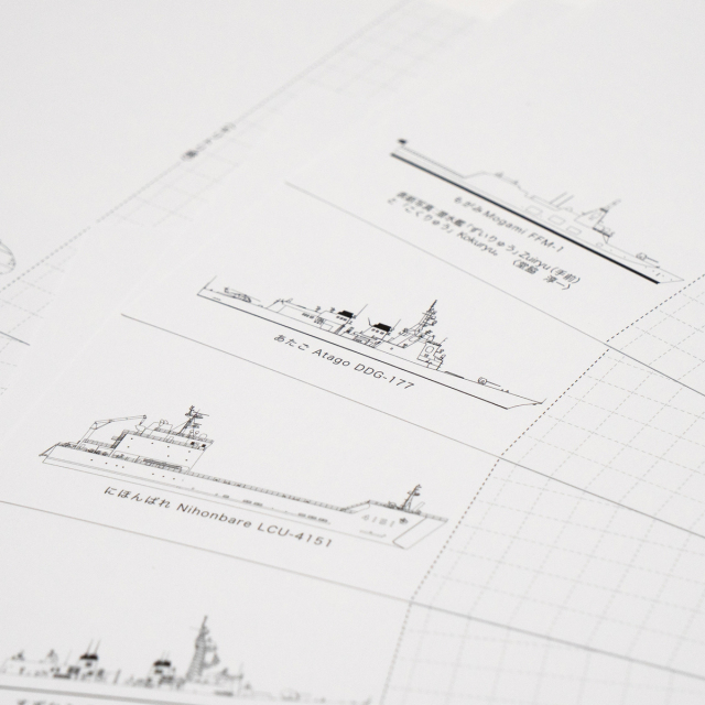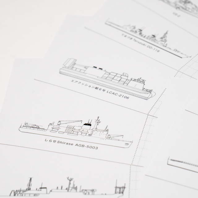 裏面:表面の艦艇・航空機の側面図をあしらい、使用後は写真部分を切り取って絵ハガキとして御利用いただけます。